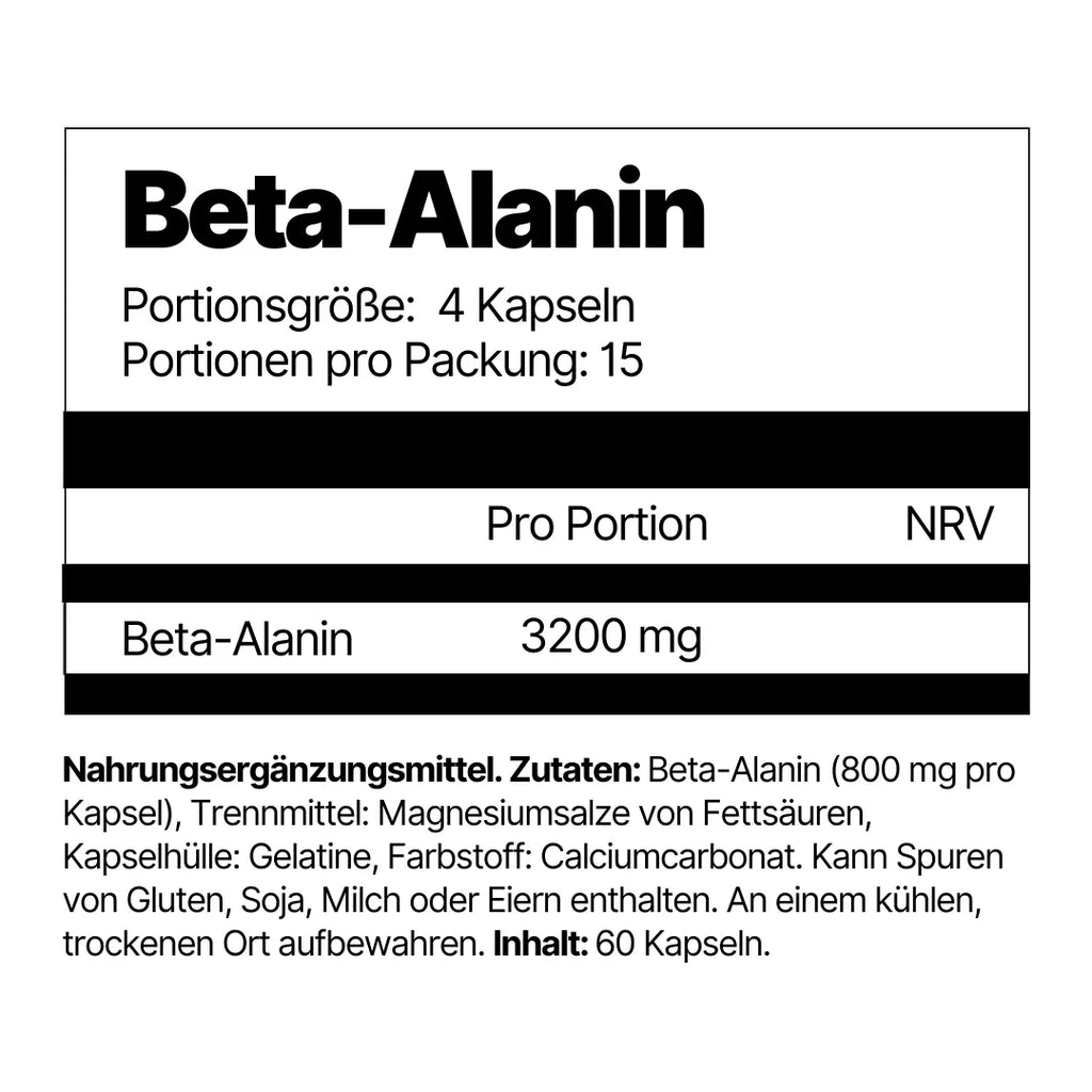 Nahrungsergänzungsmittel. Zutaten: Beta-Alanin (800 mg pro Kapsel), Trennmittel: Magnesiumsalze von Fettsäuren, Kapselhülle: Gelatine, Farbstoff: Calciumcarbonat. Kann Spuren von Gluten, Soja, Milch oder Eiern enthalten. An einem kühlen, trockenen Ort aufbewahren. Inhalt: 60 Kapseln.