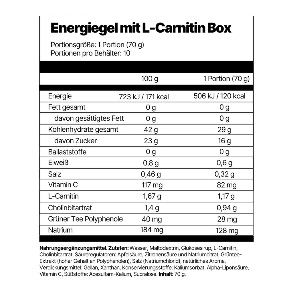 Das Energiegel mit L-Carnitin enthält 1,17 Gramm L-Carnitin pro Gel, das das Fett in Energie umwandelt. Der Körper greift bei intensiver körperlicher Betätigung hauptsächlich auf seine eigenen Glykogenspeicher zurück, jedoch hilft L-Carnitin in Kombination mit Kohlenhydraten bei der Fettverbrennung auch bei hohem Puls.