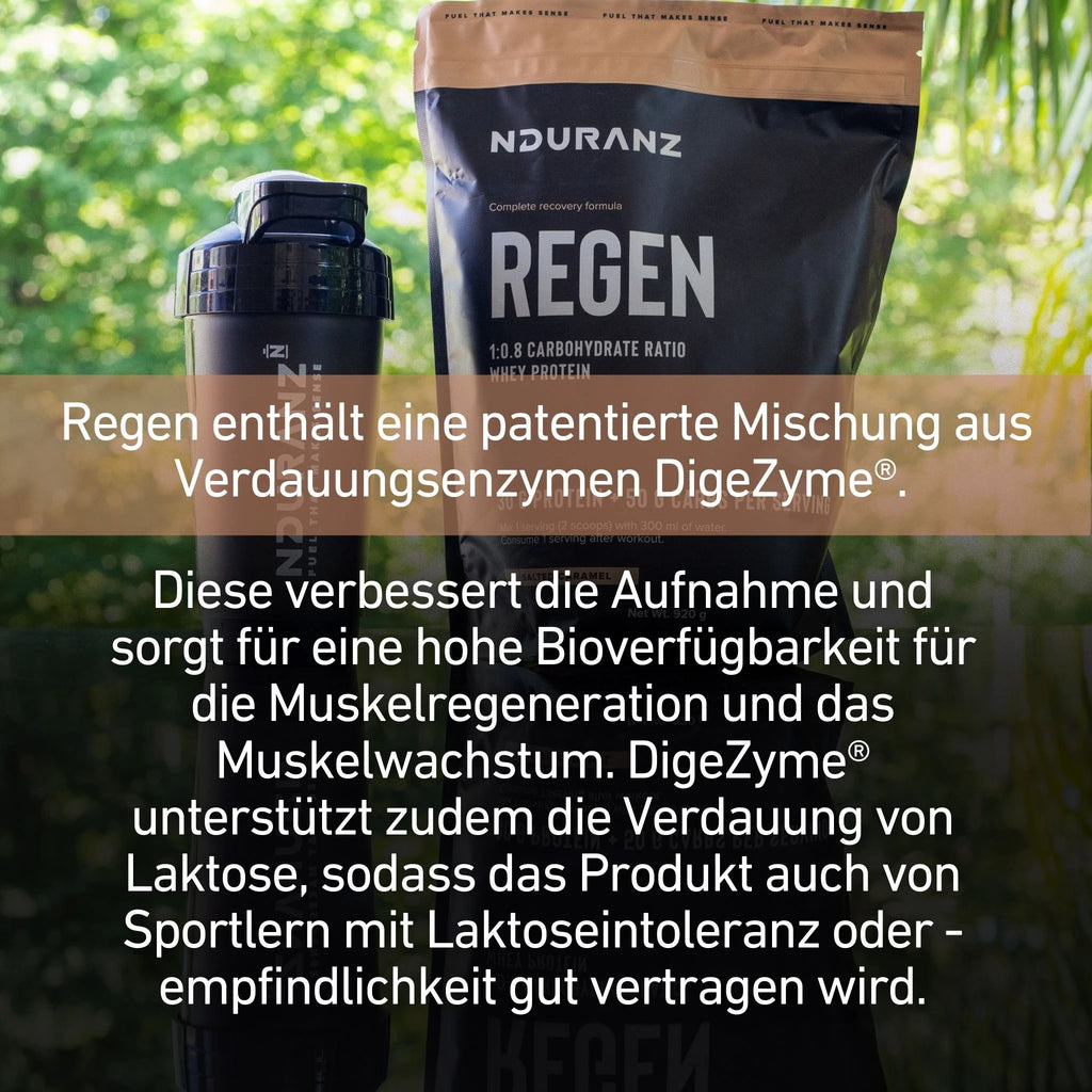 Regen enthält eine patentierte Mischung aus Verdauungsenzymen DigeZyme®. Diese verbessert die Aufnahme und sorgt für eine hohe Bioverfügbarkeit für die Muskelregeneration und das Muskelwachstum.