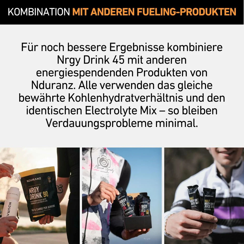 Nrgy Drink 45 ist der ideale Energielieferant für Hochleistungssportler, die eine hohe Kohlenhydratzufuhr und eine optimale Hydratation benötigen – ganz ohne unnötige Inhaltsstoffe oder Verdauungsprobleme.
