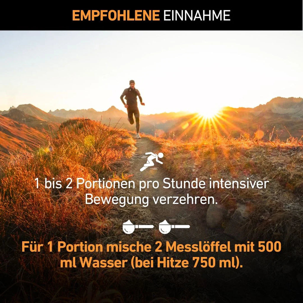 Für 1 Portion mische 2 Messlöffel mit 500 ml Wasser (bei Hitze 750 ml).